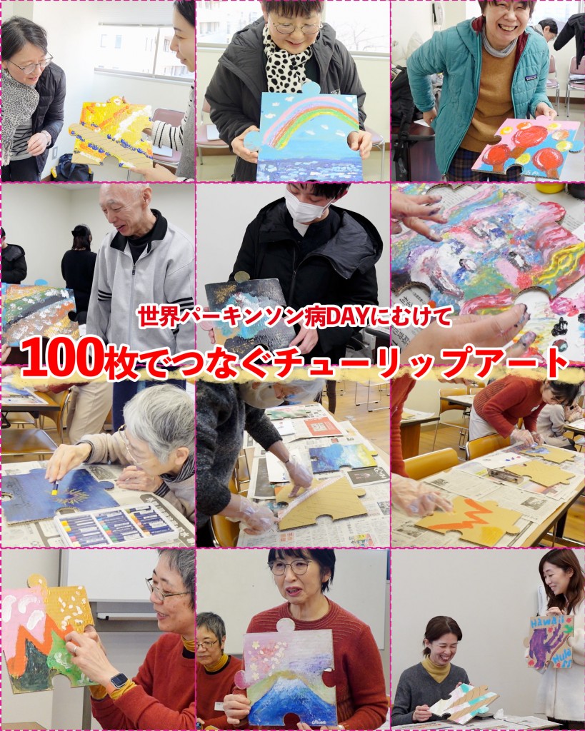世界パーキンソン病デーのシンボルであるチューリップをモチーフに、100枚のアートピースをつなぎ合わせて、1枚の巨大チューリップアートを完成させる企画です。